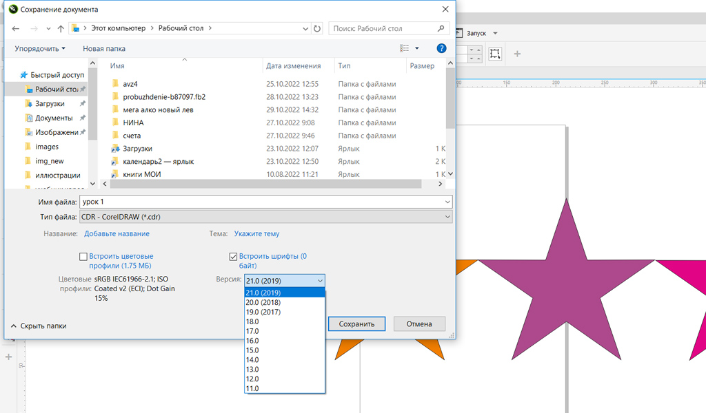 Для этого откройте меню «Файл» и выберите команду «Сохранить». У вас откроется окно сохранения, как на рис. 19. Дайте имя документу (можно по-русски или по-английски). Выберите рабочий стол и сохраните в любой версии программы. Тип файла у вас должен быть CDR.