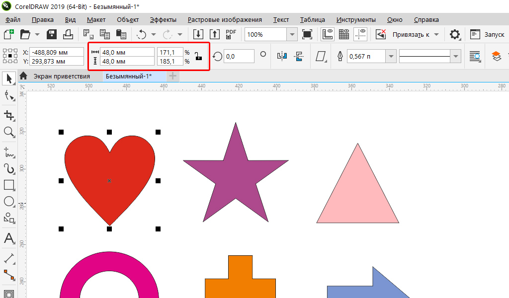 Первый параметр – длина объекта, второй параметр – ширина объекта. На рисунке 23 выделен инструментом «Указатель» объект «Сердечко» и на панели свойств отображаются его длина и высота.