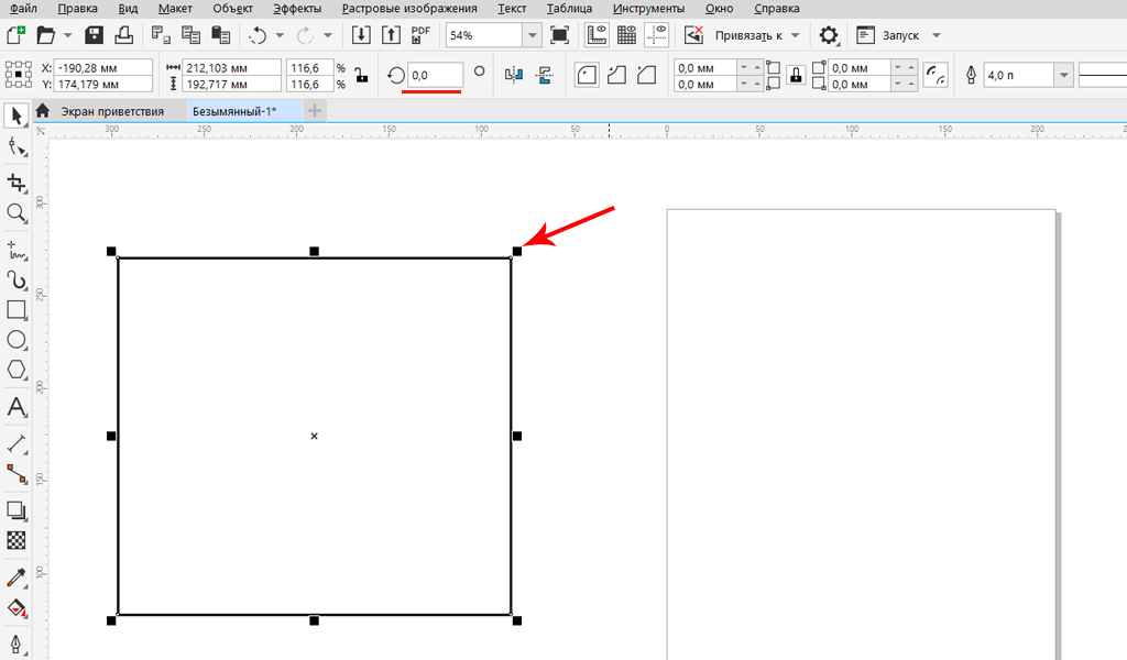 Уменьшить или увеличить объект можно, перемещая маркеры объекта (объект должен быть выделен инструментом «Указатель»). На рисунке 25 красной стрелочкой показан угловой маркер объекта, который позволяет масштабировать объект (уменьшать или увеличивать).