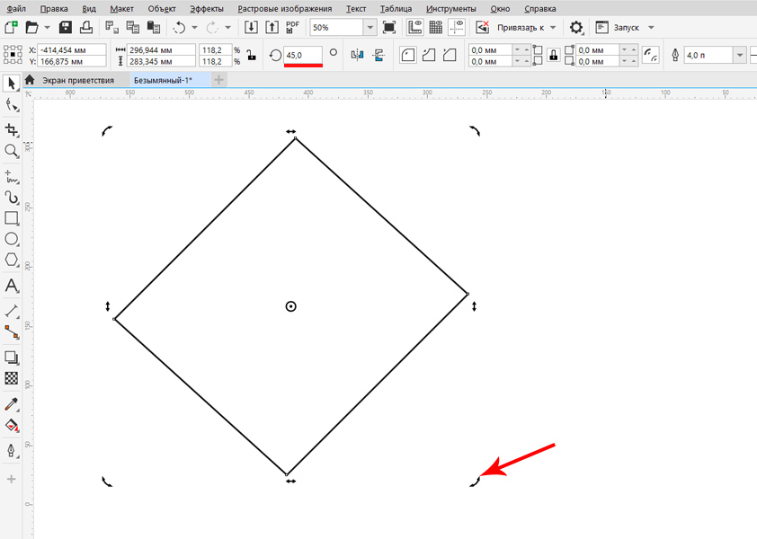 Поворот на произвольный угол можно сделать, дважды щелкнув на объекте, и перемещая двунаправленную стрелочку. Иногда требуются задать определенный угол поворота. Для этого на панели свойств находим окошко, где задаем нужный градус поворота – 45, 90, 270 и т.д. и щелкаем Enter.