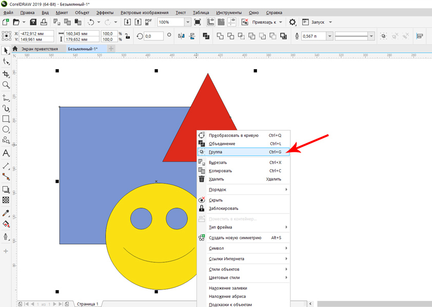 Или используйте «горячие клавиши» (Ctrl + G), тогда правой клавишей щелкать не нужно, достаточно просто выделить инструментом «Указатель» несколько объектов.