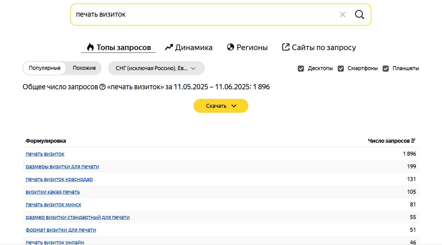 Этот сервис может показать на каких устройствах и сколько человек в месяц искали этот запрос: на планшете, на десктопе (ПК) или на мобильном устройстве (смартфоне).