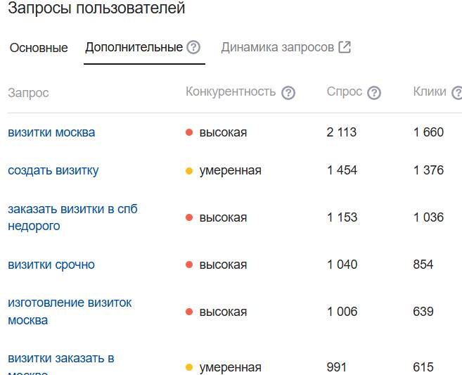 В этом сервисе статистика несколько отличается, но зато здесь можно отследить сразу сайты конкурентов (написаны напротив ключевого слова) и добавить к ключевому слову минус слова. Здесь так же предлагаются похожие ключевые фразы в разделе «Дополнительно». См. рис. 14. Например, с запросом «печать визитки» пользователи ищут эту услугу еще и по дополнительным ключевым словам: «создать визитку», «заказать визитку» и т.д.