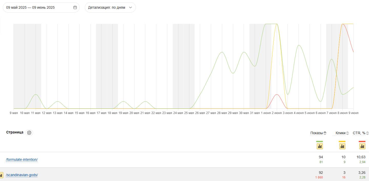 Рис. 15. Показы, клики и CTR в Яндекс.Вебмастер