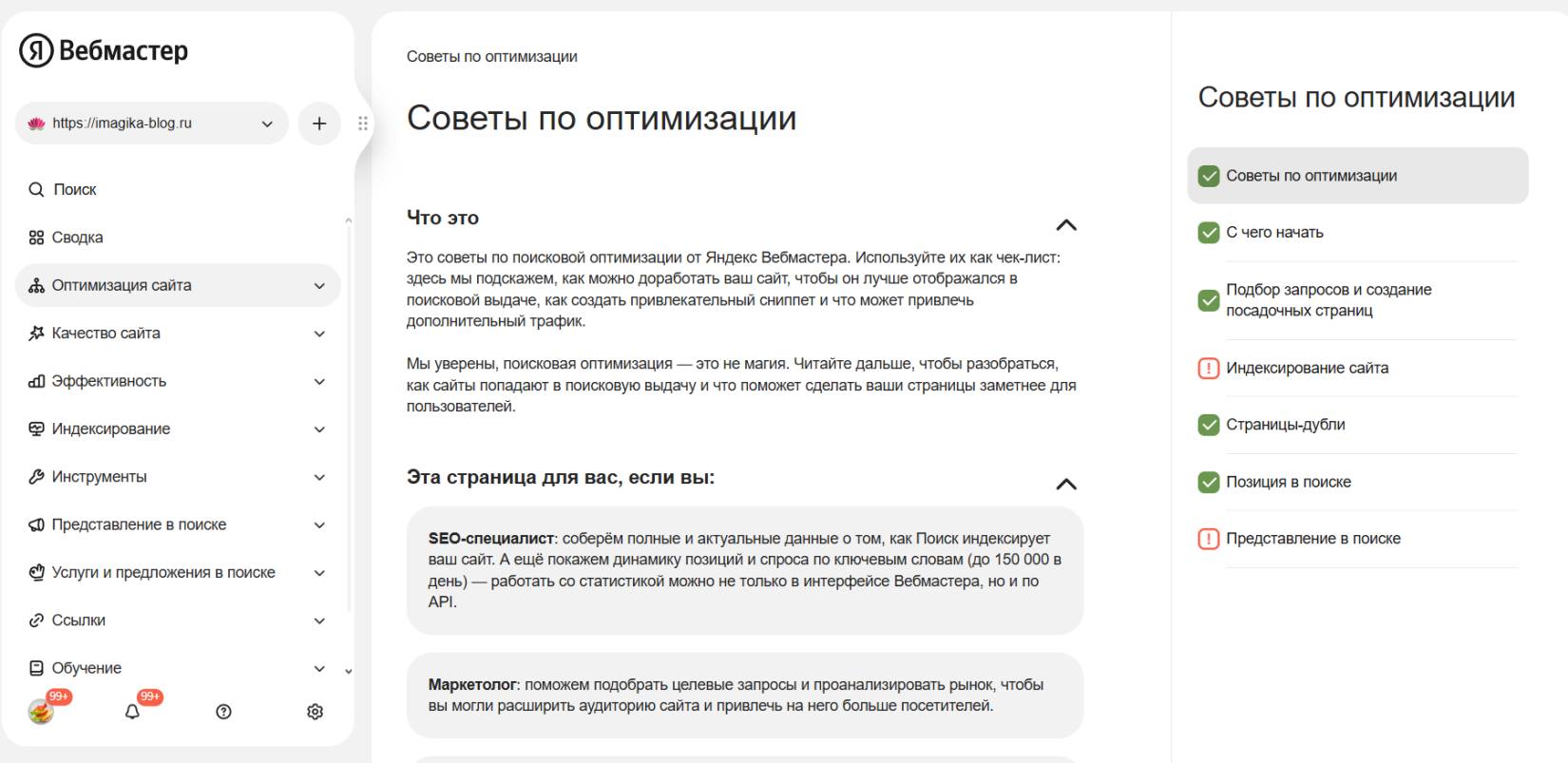 Рис. 16. Советы по оптимизации сайта в сервисе Яндекс.Вебмастер