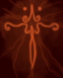 По стенам опять же змеились и сплетались стебли странных растений, но в этом помещении они были полыми и лишенными шипов, по ним же текла яркая ало-рыжая субстанция. Все эти странные трубки сплетались в невероятных завитушках и непонятных узорах, но все же образовывали на потолке и стенке один и тот же символ.