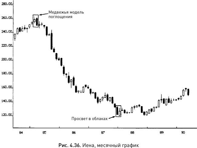 На рисунке 4.36 можно заметить, что нисходящая тенденция, начавшаяся с медвежьей модели поглощения в конце 1984 г., завершилась в середине 1987 г. формированием просвета в облаках. Этот сигнал разворота в основании не привел к восстановлению рынка, но очевидно, что давление продавцов ослабло. Еще почти год торги шли в боковом диапазоне, и лишь затем началось ралли.