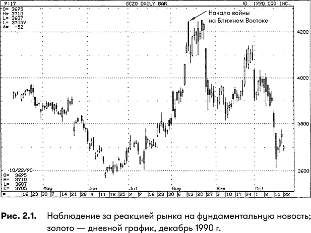 Надежнее, пожалуй, открыть позицию после выяснения реакции рынка на поступившую информацию, а не в момент ее поступления. Как отметил Бернард Барух – биржевой миллионер и советник президента, на колебания рынка влияют «не сами события, а наша реакция на них». Из рис. 2.1 видно, что реакция рынка на новость может не уступать по значимости самой новости.