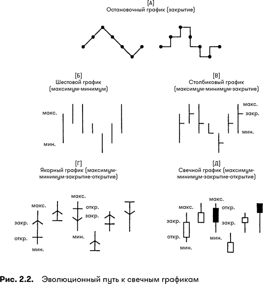 А теперь обратимся к рис. 2.2, на котором прослеживается путь, увенчавшийся появлением свечных графиков.