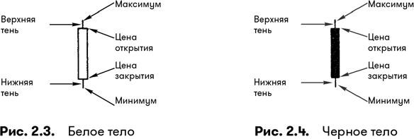 Для овладения аналитической мощью свечей нужно прежде всего научиться строить стандартную свечу. Из рис. 2.3 и 2.4 видно, что она состоит из прямоугольной части и двух тонких линий сверху и снизу. Почему графики названы свечными, догадаться нетрудно: составляющие их части нередко напоминают свечи с фитилями. Прямоугольная часть свечи называется телом (real body). Оно отражает диапазон между ценами открытия и закрытия данной сессии. Если тело черное (т. е. закрашенное) – значит, сессия закрылась ниже, чем открылась. Белое (т. е. незакрашенное) тело означает, что сессия закрылась выше, чем открылась.