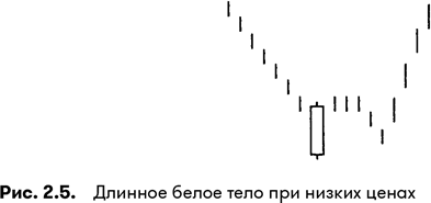 Длинное белое тело при низких ценахКак правило, отдельно взятая свеча не является достаточным основанием для того, чтобы прогнозировать немедленный разворот. Но она может служить ранним предупреждением о возможном изменении прежней тенденции. Так, длинное белое тело в области низких цен может быть первым признаком того, что нисходящая тенденция завершилась (см. рис. 2.5). Длинная белая свеча показывает, что медведи фактически не противодействуют подъемной силе рынка. Чем ближе цена закрытия к максимуму сессии и чем длиннее белое тело, тем значимее свеча.