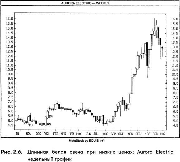 Как видно из рис. 2.6, в конце 1991 г. курс акций Aurora Electric стабилизировался у отметки 5 долл. Первым признаком того, что быки пытаются перехватить инициативу, послужило необычно длинное белое тело 1. Обратите внимание, насколько растянуто это тело по сравнению с предыдущими. Однако почти такое же длинное, но только черное тело (о черных телах см. ниже), которое появилось после свечи 1, показало, что медведи еще способны противостоять наступлению быков. В начале 1992 г. образовалась еще одна необычно длинная белая свеча (2). Она открылась на своем минимуме (у нее нет нижней тени), а закрылась на максимуме (нет верхней тени). Подобные свечи крайне сильны, особенно при такой длине, как у свечи 2. Свеча 3 – это еще одна сильная белая свеча, взметнувшая цены на новые многомесячные максимумы. Появление высоких белых свечей 1 и 2 в одной области (вблизи 5 долл.) свидетельствует о наличии здесь мощной поддержки. Поэтому неудивительно, что, вернувшись к этому уровню в июле-августе 1992 г., дальше цены не падали.