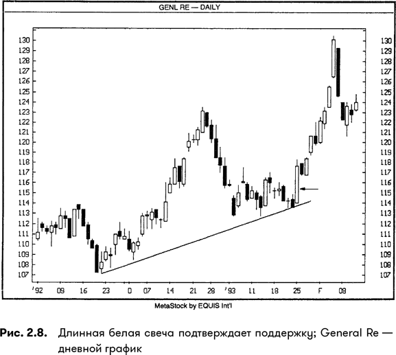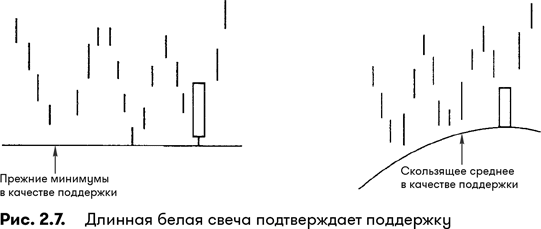 Как следует из рис. 2.7, если высокая белая свеча отражается от уровня поддержки, это подчеркивает решительность быков. Образование длинной белой свечи при проверке области поддержки – например, линии тренда, скользящего среднего или уровня коррекции – служит дополнительным подтверждением поддержки.