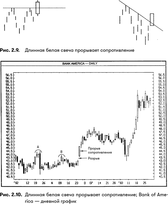 Длинное белое тело прорывает сопротивлениеПрорыв уровня сопротивления высоким белым телом обычно является признаком силы рынка (см. рис. 2.9). Как явствует из рис. 2.10, максимумы в областях А и В свидетельствовали о наличии сопротивления вблизи отметок 44 и 45 долл. В конце ноября возникло вытянутое белое тело, открывшееся с разрывом вверх и закрывшееся на максимуме сессии. Эта высокая белая свеча подтвердила серьезность прорыва упомянутой полосы сопротивления. Обратите внимание, что в начале 1993 г. разрыв перед белой свечой стал областью поддержки. Вопрос о значимости разрывов в качестве поддержки будет рассмотрен в следующей главе при обсуждении окон.
