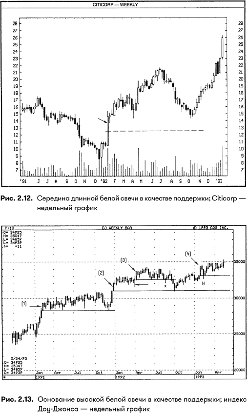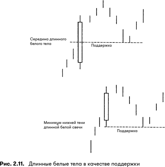 Рис. 2.11 демонстрирует одно из наиболее впечатляющих свойств белых свечей, а именно: их способность оказывать ценам поддержку. Это очень полезное свойство, так как оно позволяет выявлять зоны поддержки, которые не видны на столбиковых графиках. Откат цен должен встретить поддержку либо на уровне середины длинного белого тела, либо в основании всей белой свечи, включая и нижнюю тень. Согласно японским источникам, длинное белое тело должно служить поддержкой при растущем рынке. Однако мой опыт говорит, что оно бывает поддержкой и при падающем рынке. Причиной коррекции после образования крайне высокого белого тела может стать кратковременная перекупленность рынка (т. е. цены подскочили слишком резко и высоко). В такой ситуации частичная коррекция предшествующего подъема может помочь рынку выйти из состояния перекупленности.