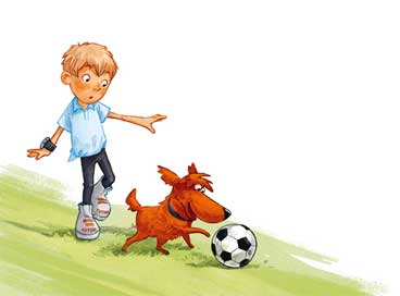 Но мальчик по имени Антон всё не решался коснуться мяча. Только он приподнял для пробы ногу-«тупицу», как откуда ни возьмись к нему пулей подлетел маленький лохматый пёс. Он с восторгом набросился на мяч и своими короткими лапками ловко загнал его обратно на поле.