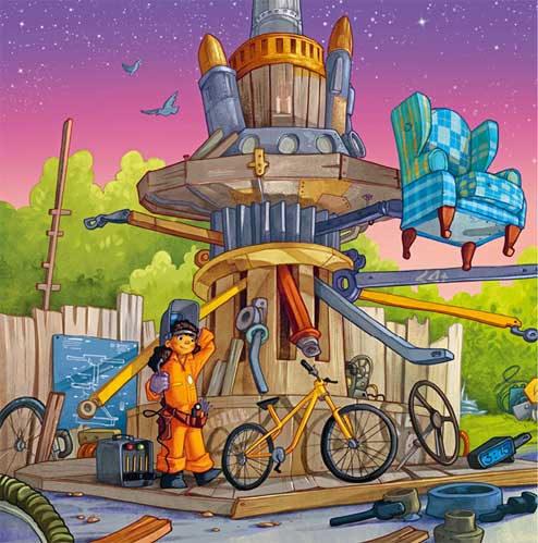 Перед сараем стояла угловатая конструкция, собранная из старых досок, каких-то палок и другого лома. Из этой странной конструкции по всему периметру торчали восемь металлических рычагов. На одном из них держалось старое кресло с ушками, обитое тканью в клеточку. Над другим как раз кипела работа. Девочка в ярко-оранжевом комбинезоне ползала туда-сюда между выступающими частями. Она была заметно крупнее и старше Антона. На поясе у неё был ремень со множеством карманов и различных инструментов, а в руках – настоящий, сыплющий искрами сварочный аппарат! У Антона отвисла челюсть.