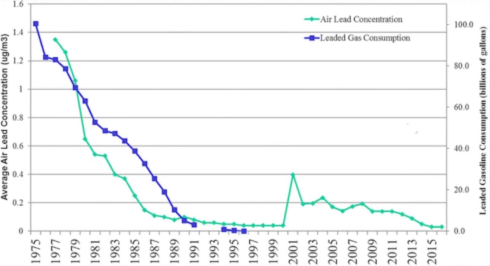 После начала ограничения свинцового топлива уровень свинца начал стремительно падать, уже в 1994 году, ещё до полного запрета свинцового бензина, уровень свинца в крови у американцев упал на 78%, по сравнению с семидесятыми, а в современном мире этот уровень уже ничтожно мал.
