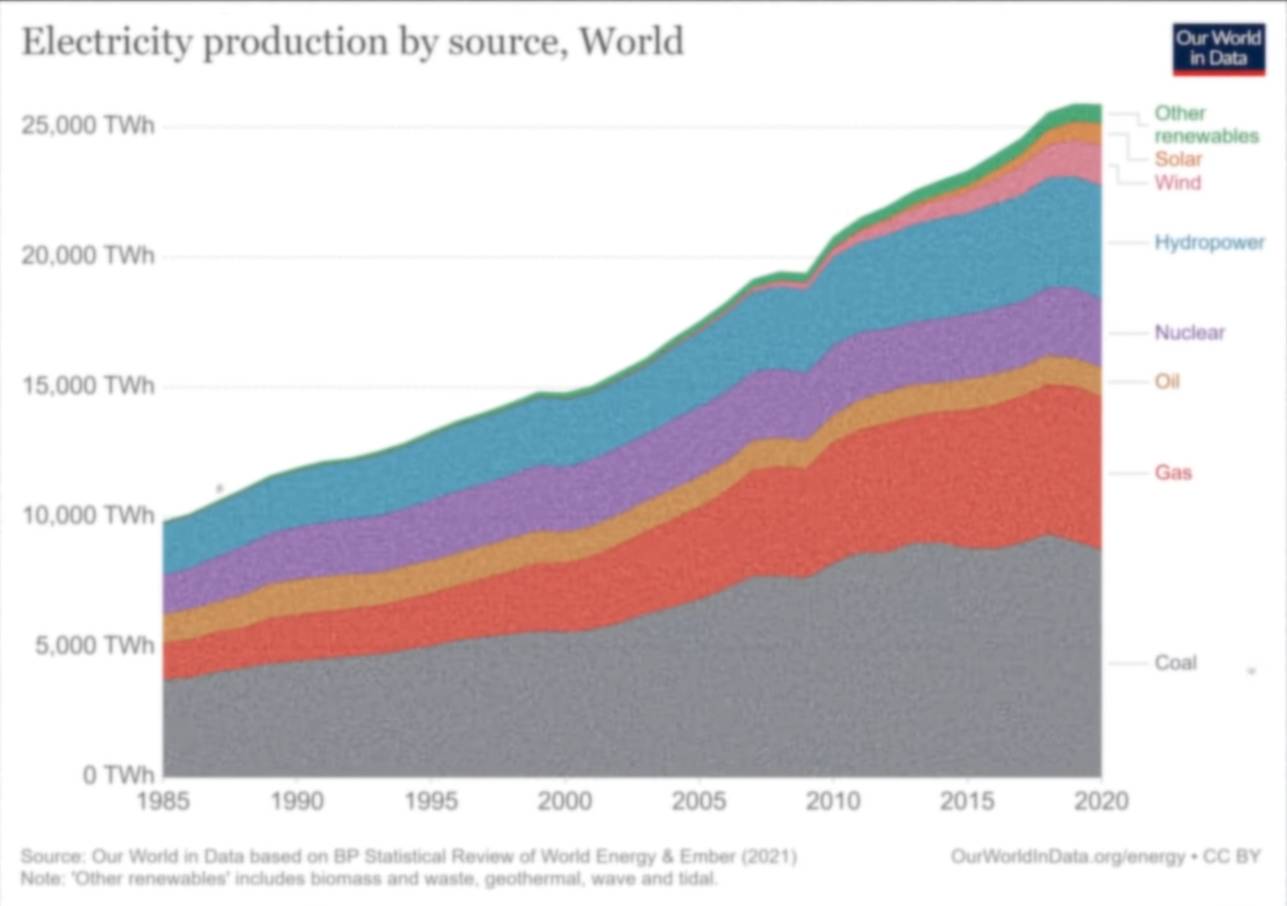 Если рассматривать только электроэнергию, которая является составляющей частью всей энергии, то там ситуация отличается не драматически: на сегодняшний день 63,3% от общей электроэнергии вырабатывается за счёт сжигания ископаемых, преимущественно угля. А в 2000 году, этот процент был 64,8. За 21 год доля упала ровно на 1,5%.