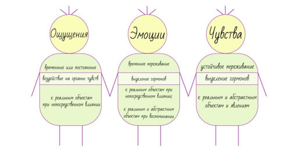 Резюме. На схеме 3 изображены три брата, которые всегда держатся друг за друга и не способны действовать самостоятельно. Стоит понимать, что все процессы организма тесно связаны между собой и их разделение схематично и создано лишь для того, чтобы облегчить наше понимание этих процессов. Работа нервных клеток, выброс гормонов, реакция мозга и многие другие процессы действуют практически одновременно. Находясь в кондитерском магазине наши обонятельные рецепторы отправляют сигналы в мозг, возникает моментальная эмоция неудовлетворенности, которая порождает чувство счастья/несчастья/голода в зависимости от контекста и все это происходит практически одновременно. Новость или реклама, услышанная по телевидению в сопровождении тревожной музыки, может вызвать подавленное настроение на весь день из-за гормонов, поступивших в кровь (сигнал – слух – ассоциации – гормоны – общее самочувствие). Поэтому не так просто, но важно понимать, что и почему мы чувствуем.
