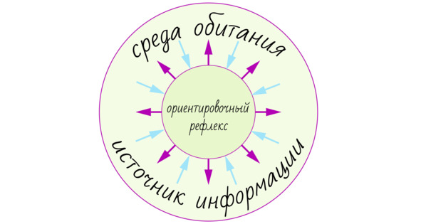 На схеме вы видите, что контакт между средой обитания и ориентировочным рефлексом «что такое?» никогда не прекращается и идет постоянная актуализация взаимосвязи поведения организма с окружающей средой. Как только меняется среда обитания (естественная и виртуальная), меняется и поведение.