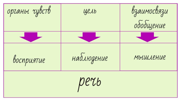 В отличие от восприятия, при наблюдении ведущую роль играет работа второй сигнальной системы (речь).