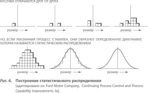 Ключевая фраза для понимания рисунка 6 – «если сам исходный процесс стабилен» – напрямую связана с понятием статистически управляемого процесса. Идея заключается в том, что если в ходе измерений на процессы оказывает влияние некоторое постороннее воздействие (например, по отношению к приведенным выше примерам: настройка машины изменилась, норма обслуживания для механика по наладке увеличилась, вы сели на диету, ваш поставщик стал использовать сырье плохого качества и т. д.), то результаты измерений не могут рассматриваться как происходящие из одного и того же источника, и, таким образом, никакое стабильное распределение нельзя использовать для его представления. На самом деле, как мы увидим позже, определение стабильности, представляемое единственным фиксированным распределением, слишком идеализировано с практической точки зрения (позже мы будем ссылаться на эту искусственно-идеальную ситуацию как на представляющую идеально точную стабильность).
