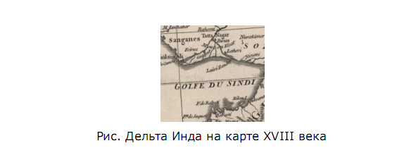 Этот фрагмент самый сложный для понимания. По отношению к нынешнему Египту он совершенно не понятен. Если считать, что морской залив в Аравии это нынешнее Красное море («40 дней плавания»), то предположить, что оно может быть занесено илом, ― очень смелое предположение. Предположить, что раньше вместо нынешнего Нила был залив, который доходил до Эфиопии, просто невозможно. («Между тем Нил течет из Ливии, затем проходит через Эфиопскую землю и впадает в море в Египте», Евтерпа, 22). Фрагмент абсолютно не соответствует картине, которую мы видим на карте возле Египта. А вот на северо-западе Индостана, похожую картину можно представить. Предположение, что Инд перед впадением в Аравийское море, мог быть заливом, не лишено оснований. Правда, береговая линия Инда увеличивается не только из-за наносов, которые несет Инд, как считал Геродот, но и из-за подъема суши в этих местах. По этой же причине там происходит рост гор. Возле Нила никакого подъема суши нет, поэтому там береговая линия практически не меняется, и там мысль о том, что дельта Нила была когда-то морем, никому в голову прийти не могла. О каком Аравийском заливе по отношению к Индии могла идти речь? Подсказка есть на карте XІX века, приведенной выше. На этой карте присутствует Качский залив, которого на современной карте уже нет. Не сложно предположить, что во времена Геродота этот залив был значительно больше, хотя надо признать, что размеры залива, указанные Геродотом (40 дней плавания), вызывают сомнения. На фрагменте карты XVІІІ века внизу присутствует этот же залив, но размеры этого залива значительно больше. Точность этой карты вызывает сомнение, так как на карте XІX века и на современной карте у входа в Качский залив можно увидеть возвышенности, которые отсутствуют на карте XVІІІ века, на которой в этом месте сплошная водная поверхность и нет никаких островов, а они должны там находиться.
