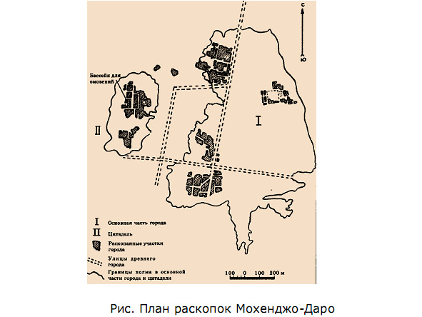 В своей книге «Аксиомы истории. Анализ географии древности», я приводил фрагмент, имеющий отношение к Вавилону: «Реки Тигр и Евфрат текут посреди Месопотамии и Вавилонии и впадают в Нил. Рассказывают, что эти реки мелеют, когда Нил затопляет Египет; когда же он вновь входит в русло, то и эти реки становятся полноводными…». (Эккерхард из Ауры, Вюрцбургская хроника, [81]). Тогда я предположил, что этот фрагмент можно объяснить большим количеством дубликатов в названиях одних и тех же географических объектов. Но когда пришло понимание, где находился Египет, о котором пишет Геродот, стало ясно, что непонимание этого фрагмента связано с неправильной локализацией Египта и Нила, названия, которых были привязаны ошибочно к нынешнему Египту. Если Нил Геродота это нынешний Инд, то понять, где находится Месопотамия (Междуречье) совсем не сложно, достаточно на карте найти место, где в Инд впадают несколько крупных рек. Это место ― знаменитый Пенджаб, Пятиречье. Этот фрагмент противоречит предположению, что Евфрат это река Сарасвати, но не противоречит нахождению Евфрата на северо-западе Индии. Интересно рассмотреть описание Вавилона у Геродота и сравнить это описание с развалинами древнего города Мохенджо-Даро. Ниже приведены развалины этого города из «Википедии» и план раскопок из работы: «История Древнего мира. Древний Восток. Индия, Китай, страны Восточной Азии», [26]