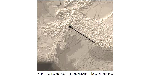 «Паропанис, Парапамис, Паропамис – …см. также Парнас (с); – идентифицируется как нын. горная система Гиндукуш (перс. Хинду Кух – «Индийская гора») в Афганистане, Пакистане и Индии; примыкает к Памиру, Гималаям и хребту Каракорум (= Каракорам, в Кашмире и Китае, к юго-востоку от Памира); центр – 3б°00», 71°30»». [23].