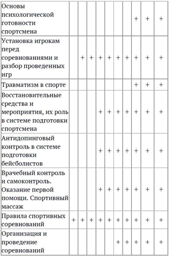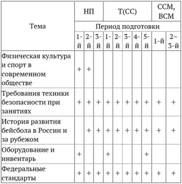 Теоретическая подготовка предусматривает наличие тем, обеспечивающих формирование не только знаний, связанных со спортивной игрой бейсбол, но и мировоззренческих знаний: место и роль физической культуры и спорта в современном обществе; основы законодательства в сфере физической культуры и спорта (правила избранных видов спорта, требования, нормы и условия их выполнения для присвоения спортивных разрядов и званий по избранным видам спорта; федеральные стандарты спортивной подготовки по избранным видам спорта; общероссийские антидопинговые правила, утвержденные федеральным органом исполнительной власти в области физической культуры и спорта, и антидопинговые правила, утвержденные международными антидопинговыми организациями; предотвращение противоправного влияния на результаты официальных спортивных соревнований и информация об ответственности за такое противоправное влияние); о медико-биологических и гигиенических основах спортивной деятельности, о средствах и методах спортивной тренировки, а также приобретение научно-практических знаний по современным способам восстановления организма после физических нагрузок, профилактики травматизма, основам здорового образа жизни.
