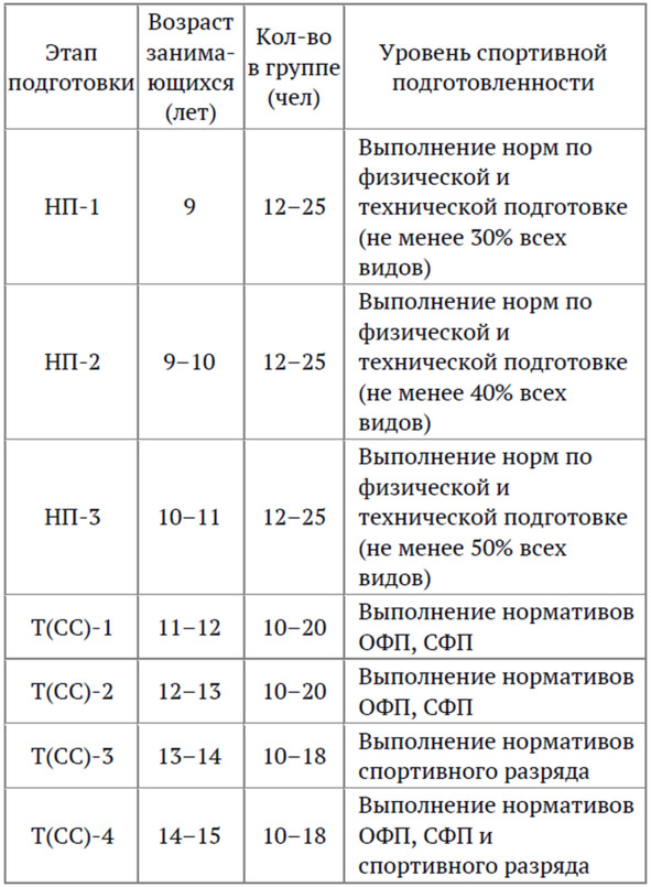 На тренировочный этап (спортивной специализации) зачисляются на конкурсной основе занимающиеся в возрасте от 11—16 лет и выполнившие требования ФССП, а также переводятся спортсмены, выполнившие нормативы, установленные для этапа начальной подготовки. Перевод по периодам подготовки на тренировочном этапе осуществляется по результатам тестирования (выполнения занимающимися контрольно-переводных нормативов по общей физической, специальной подготовке) с учетом результатов соревновательной деятельности.