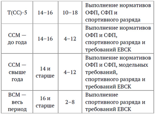 • На этапы начальной подготовки второго и третьего годов спортивной подготовки (НП-2, НП-3), тренировочный этап с первого по пятый годы спортивной подготовки (Т (СС) -1, Т (СС) -2, Т (СС) -3, Т (СС) -4, Т (СС) -5), этап совершенствования спортивного мастерства (ССМ-1, ССМ-2) и этап высшего спортивного мастерства (ВСМ) зачисляются спортсмены, успешно сдавшие переводные нормативы соответствующих этапов подготовки, установленные ФССП и выполнившие необходимые программные требования по спортивной квалификации (в случае установления данных требований ФССП).