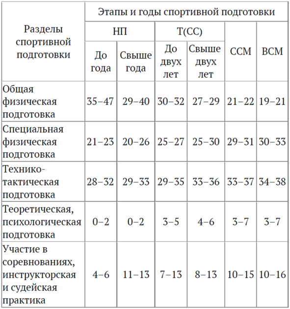 Таблица №4. Соотношение объемов тренировочного процесса по видам спортивной подготовки на этапах спортивной подготовки (%)