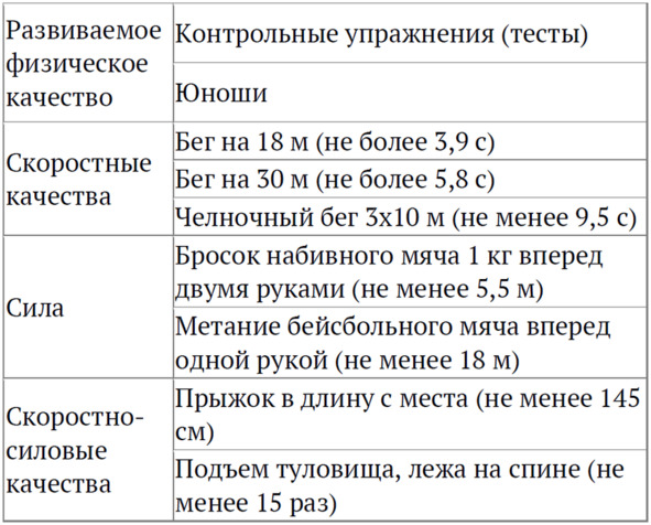 Таблица №6. Рекомендуемые контрольные упражнения для проведения тестирования при поступлении на этап начальной подготовки