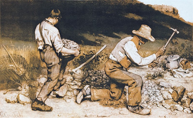Прудон начинает анализ картины с таких очевидных нелепостей, как, например, описание старика: «Его одеревенелые руки подымаются и опускаются с правильностью рычага. Вот механический, или механизированный, человек, в горьком положении, в которое его ввергли наша цивилизация и наша несравненная промышленность»; или описание юноши: «Посмотрите теперь на этого жалкого юношу, который несет камни, на его долю не достанется никаких радостей жизни; осужденный раньше срока на тяжелый труд, он уже весь изможден: у него уже сведено плечо, походка его какая-то расслабленная ‹…› Истомленный с отрочества ‹…› вот пролетариат». Однако дальше описание демонстрирует некоторую наивную прозорливость: «Если бы Курбе ‹…› был так же влюблен в антитезы, как Виктор Гюго, ему ничего не было бы легче, как ввести в свою картину контраст; он мог бы поместить своих каменщиков вблизи решетки богатого замка: за этой решеткой в перспективе мог бы находиться обширный и роскошный сад ‹…› но Курбе предпочел просто большую дорогу, пустыню с ее монотонностью ‹…›; поэзия уединенной дороги совершенно не то что вычурный контраст роскоши и нищеты» [32]. Именно в прямоте высказывания, проявляющейся как в ее форме, так и в содержании, в строгом воздержании от комментариев и объяснений, и кроется сила этой картины.