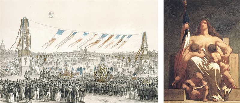 Перемены в обществе и в самих идеалах революции нашли драматическое отражение в различии между революционной картиной Делакруа «Свобода на баррикадах» (1830) с ее романтическим, индивидуалистическим подтекстом, с ее страстным интеллектуалом с запавшими глазами и в цилиндре и монументальным символом свободы в виде прекрасной «женщины с мощной грудью», и «Восстанием» Домье, написанным после революции 1848 года, где бушующую толпу призывает к действию такой же анонимный, как и она сама, лидер.