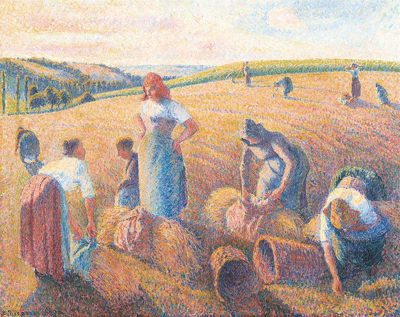 Но, как в случае «Сборщиц колосьев» (1889, рис. 17), написанных в тот период, когда анархистские симпатии Писсарро достигли своего пика и одновременно с этим он присоединился к Сёра и неоимпрессионистам, его изображения крестьянок были не просто возвращением к сентиментальному натурализму Жана-Франсуа Милле с такими его работами, как «Урожай гречихи, лето» (1868–1874). Писсарро в некотором смысле ответил на вызов Милле, демистифицировав его образ, сделав его более свободным по композиции и пестрым по колориту. На его картине одна из женщин стоит в уверенной и доминирующей позе и разговаривает с другой. Писсарро отказывается от отождествления женщины и природы, предполагаемого композицией Милле, и делает этот отказ еще более заметным за счет откровенно современной неоимпрессионистической техники.