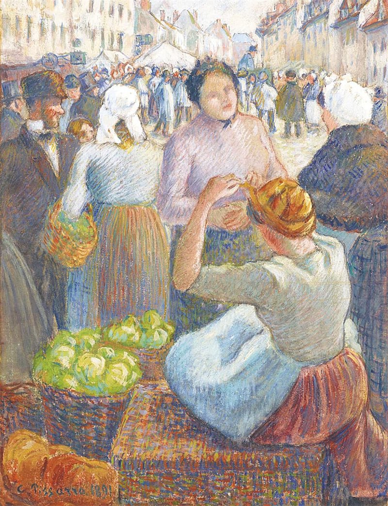 Сталкиваясь с выраженной вертикалью прилавка «Торговки свининой» (1883) или с энергичным профессиональным жестом женщины в «Птичьем рынке в Понтуазе» (1892), снова испытываешь соблазн трактовать сцены с рыночными торговками у Писсарро как метафору идеальных взаимоотношений художника со зрителем – художника, напрямую продающего свою продукцию потребителям без вмешательства ненужного посредника, то есть дилера.