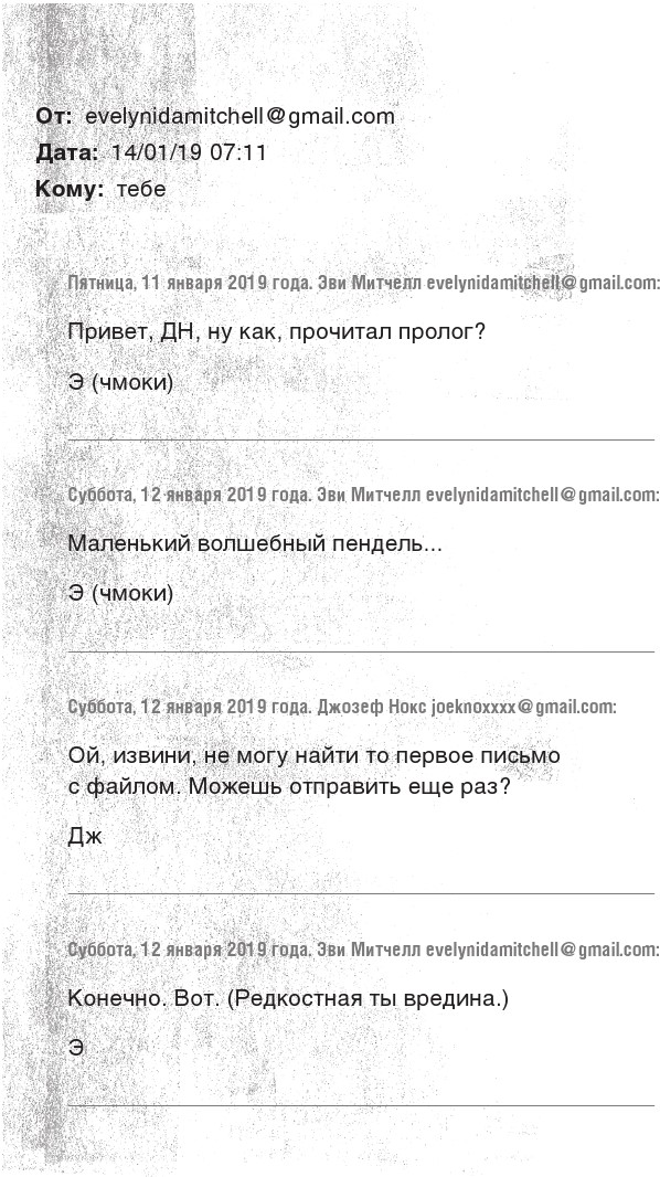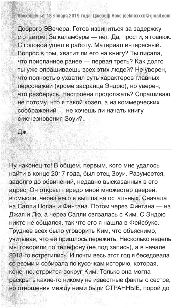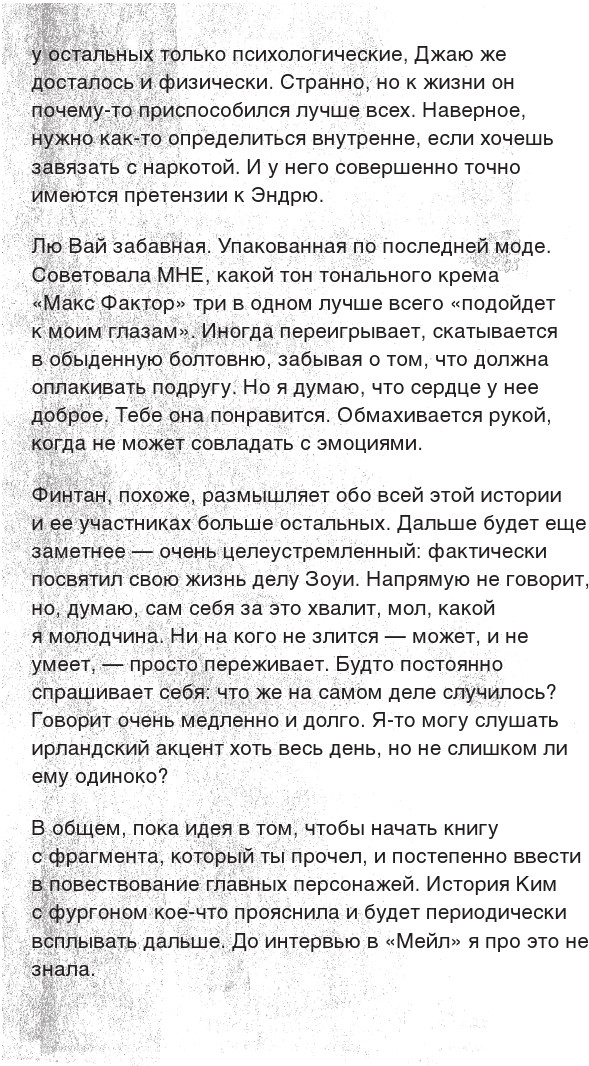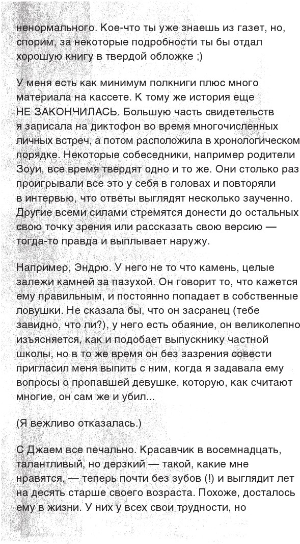 Да, в высотке кто-то воровал вещи, в том числе у Зоуи. Но какой вор польстится на обоссанную, покрытую рвотой одежду? Я так говорю не потому, что я такой злой. Порой мне кажется, что история, в которую мы все влипли, сказалась на нашей способности соображать. Подобные психологические травмы не сближают людей, а, напротив, отдаляют друг от друга. Самое малое, что мы можем сделать, – постараться вести себя достойно, и если я веду себя как-то не так в отношении Кимберли, то я готов извиниться прямо сейчас. Но о моей лучшей подруге Зоуи все эти годы нет никаких вестей. Кимберли разве не об этом пришла поговорить? Это так, ремарка.