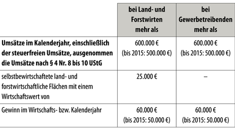 Die Grenzen orientieren sich an den Schwellenwerten des § 141 AO. Zu beachten ist hierbei jedoch, dass der handelsrechtliche Jahresüberschuss nicht in allen Fällen mit dem steuerlichen Gewinn übereinstimmt.