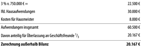 ▶Soweit ein Gästehaus an Geschäftsfreunde überlassen wird, sind die Aufwendungen nach § 4 Abs. 5 Satz 1 Nr. 3 EStG nicht abzugsfähig, da sich das Gästehaus außerhalb des Ortes eines Betriebs des Steuerpflichtigen befindet. ▶Soweit ein Gästehaus an Arbeitnehmer überlassen wird, kommt eine Zurechnung der entsprechenden Aufwendungen nicht in Betracht. →Zu den nicht abzugsfähigen Aufwendungen rechnen 1/3 aller mit dem Betrieb des Gästehauses in Zusammenhang stehenden Aufwendungen (R 4. 10 Abs. 11 Satz 1 EStR).Berechnung: