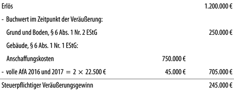 Modehersteller F mit Sitz in München unterhält in Bad Tölz, wo er weder einen Betrieb noch eine Betriebsstätte hat, ein Gästehaus mit 15 gleichwertigen Zimmern. Davon werden 10 Zimmer für Arbeitnehmer und 5 Zimmer für Geschäftsfreunde genutzt. Das Haus (Baujahr 2001) wurde zum 1. 1. 2016 für 1.000.000 € (14 Grund und Boden) erworben und voll aktiviert. Die laufenden Unterhaltskosten betrugen im Jahr 2017 30.000 €; für den Hausmeister mussten 8.000 € aufgewendet werden. Das Haus wird zum 31. 12. 2017 für 1. 200.000 € verkauft.