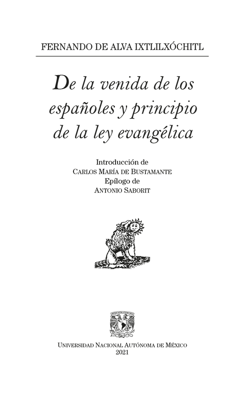 De la colección de manuscritos titulada Memoria de la Nueva España y formada a final del siglo XVIII por el virrey conde de Revillagigedo, Carlos María de Bustamante extrajo y dio a la imprenta un capítulo íntegro del Compendio histórico del reino de Texcoco. En él se da cuenta de la llegada de Hernán Cortés y los suyos al mundo dominado por el imperio mexica y de las alianzas con los naturales que desembocaron en la caída de la ciudad de Tenochtitlan. Bustamante puso a circular esta relación en 1829 como suplemento de la Historia general de las cosas de la Nueva España de fray Bernardino de Sahagún, publicada en ese momento por el propio Bustamante. Esta edición de De la venida de los españoles y principio de la ley evangélica recupera el gesto editorial de Bustamante, pero emplea el texto establecido por Edmundo O’Gorman en su edición de las Obras históricas de Fernando de Alva Ixtlilxóchitl.