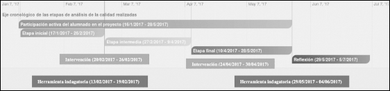 Se decidió valorar la calidad en el uso de las TIC en tres etapas distintas del citado proyecto. Como puede observarse en la siguiente figura, se determinó llevar a cabo una valoración sobre el diseño del proyecto realizado por las docentes fundadoras (etapa inicial), una valoración durante la primera mitad del desarrollo del proyecto (etapa intermedia) y una valoración sobre la segunda mitad de este (etapa final).