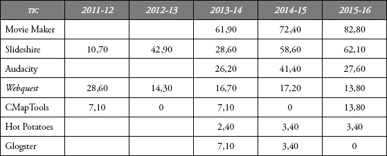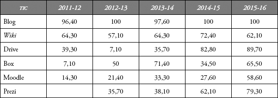 En els resultats dels qüestionaris esmentats trobem que un percentatge de més d’un 50 % de l’alumnat coneix sobretot plataformes per a publicar els seus treballs, com el blog; per al treball col·laboratiu, com el Drive; per a l’edició de vídeos, com el Movie Maker; per a fer presentacions, com el Prezi; per a emmagatzemar informació, com el BOX.