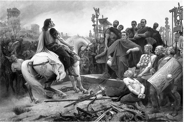 Верцингеторикс, руководитель всей войны, надев самое красивое вооружение и богато украсив коня, выехал из ворот. Объехав вокруг возвышения, на котором сидел Цезарь, он соскочил с коня, сорвал с себя все доспехи и, сев у ног Цезаря, оставался там, пока его не заключили под стражу, чтобы сохранить для триумфа.