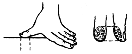 Ходим на выпрямленных ногах, сначала опираясь на всю стопу, затем на пятки, на носки, на внутреннюю сторону стоп и на внешнюю сторону стоп.