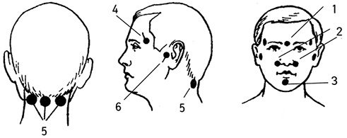 5 – точка на границе шеи и головы, чуть выше линии роста волос в ямке;