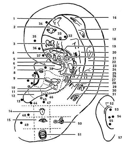 1 – пальцы стопы; голеностопная область; 2 – матка; 3 – седалищный нерв; 4 – толстая кишка; 5 – аппендикс; б – тонкая кишка; 7 – диафрагма; 8 – рот; 9 – трахея; 10 – сердце; 11 – легкие; 12 – три части туловища; 13 – зрение 1; 14 – язык; 15 – глаза; 16 – пальцы кисти; 17 – запястье; 18 – колено; 19 – почка; 20 – живот; 21 – поджелудочная железа; 22 – локоть; 23 – печень; 24 – плечо; 25 – область груди; 26 – желудок; 27 – селезенка; 28 – шейный отдел позвоночника; 29 – плечевой сустав; 30 – лопатка; 31 – шея; 32 – точка тхан-мон; 33 – ягодица; 34 – геморрой; 35 – наружные половые органы; 36 – мочеточник; 37 – нижняя часть прямой кишки; 38 – пищевод; 39 – вершина козелка; 40 – горло, 41 – нос; 42 – надпочечник; 43 – носовая полость; 44 – зрение II. 45 – яичко; 46 – регулирующая дыхание; 47 – лоб; 48, 49 – точки анальгезии; 48 – обезболивание приудалении верхних зубов; 49 – обезболиваниетри удалении нижних зубов; 50 – внутреннее ухо; 51 – миндалины; 52 – гипотензивная канавка; 53 – головная боль; 54 – почки; 55 – сердце; 56 – нижняя конечность; 57 – задняя поверхность ушной раковины.